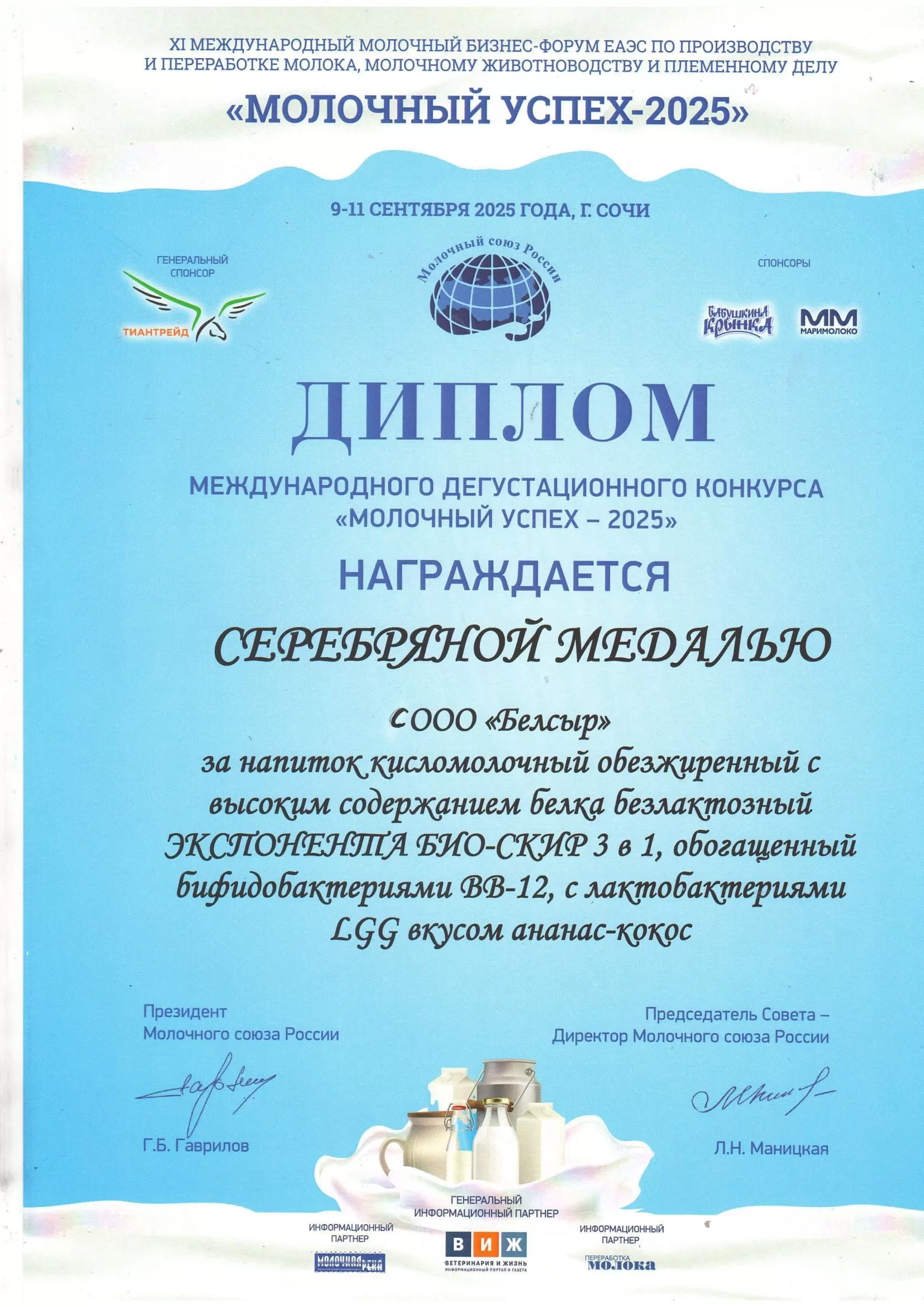 С 09.09.2025 по 11.09.2025 в г. Сочи прошёл XI Международный молочный бизнес-форум ЕАЭС по производству и переработке молока, молочному животноводству и племенному делу «Молочный успех – 2025»